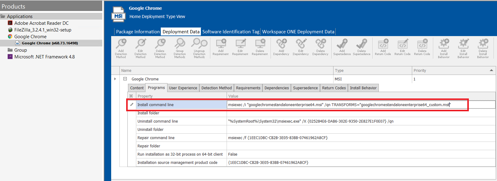 On successful import of an application into the Application Catalog Tree, you can see the Install Command line and Uninstall Command Line for the selected application in Deployment Data >> Programs >> Install Command Line and Uninstall Command Line.