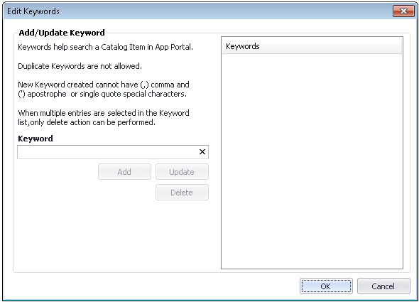 When you add a keyword on the Edit Keywords dialog box, it will be available to assign to any application in this Application Catalog.