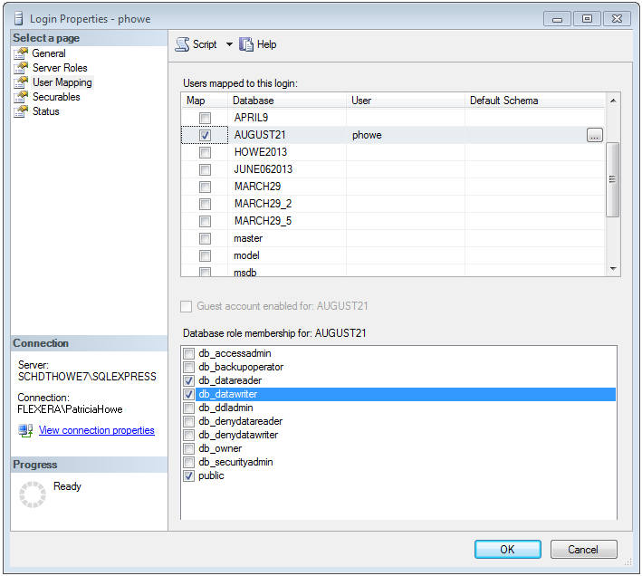 5. In the Users mapped to this login list, select the database that you want to assign permissions to.