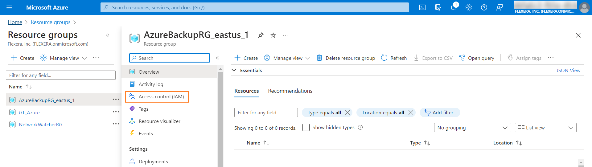 - Select Access Control (IAM) in the center pane.