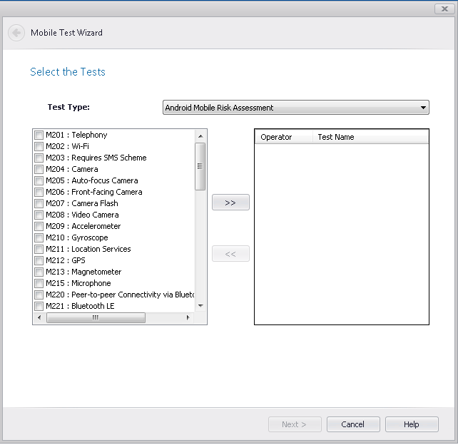 AdminStudio’s mobile risk assessment tests enable you to find out which features a specific mobile app uses, such as telephone, location services, camera, microphone, etc. You can enhance this testing by using the Mobile Test Wizard to create custom tests that combine risk assessment checks with AND or OR operators.