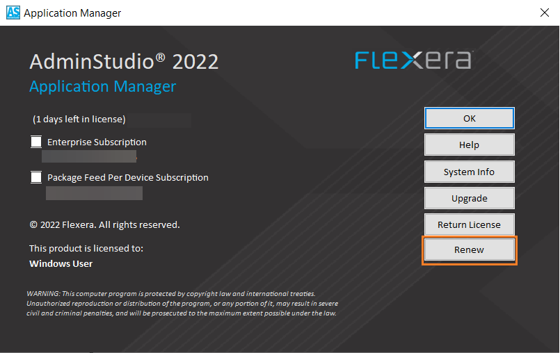 noteThe automatic reactivation is applicable only if you have previously activated AdminStudio using an activation code. If a license file was previously used for activation, then a new license file needs to be generated for the new subscription end date from the Product and License Center.
